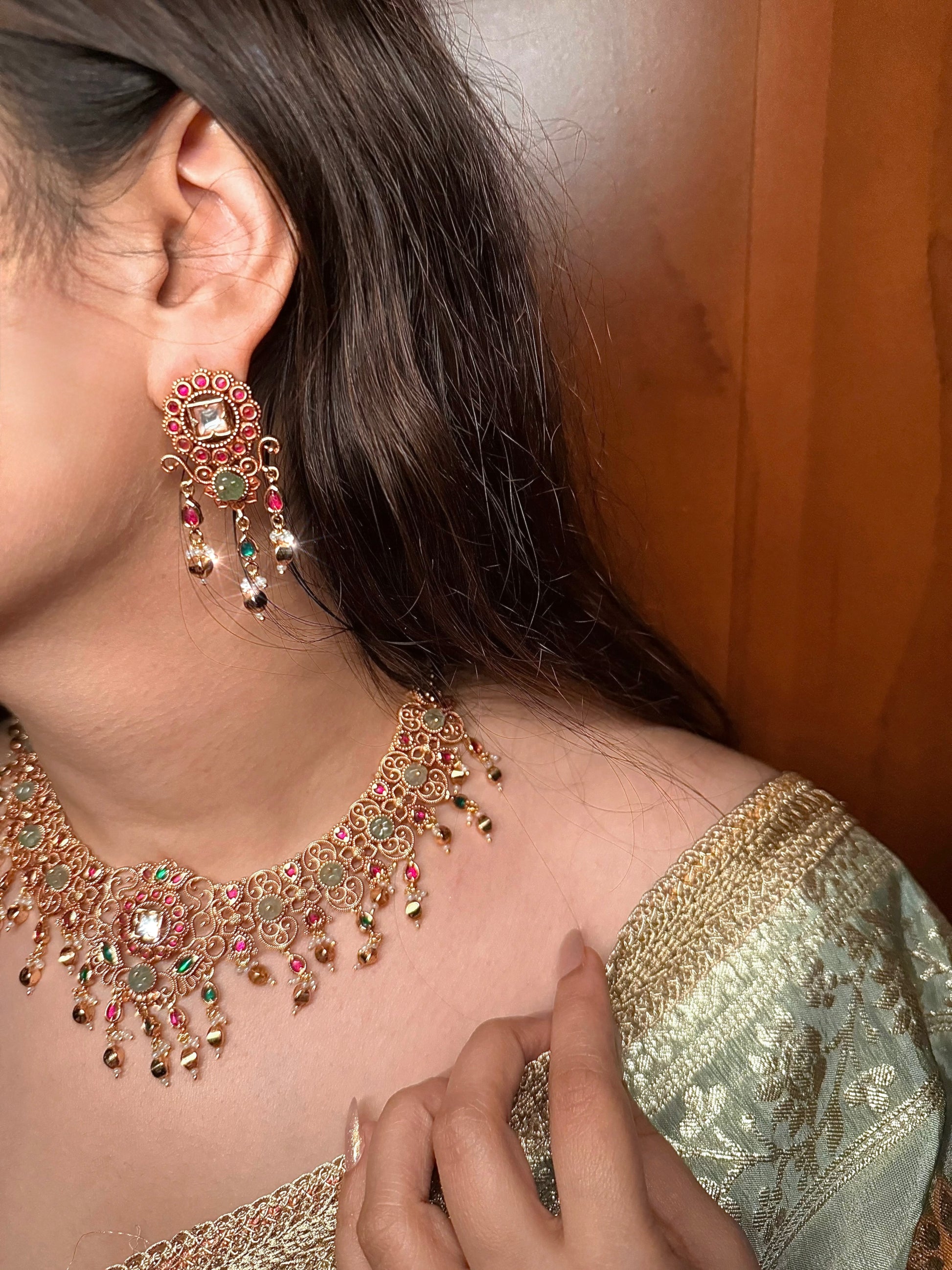 Style Tip: Let the necklace be the star — pair it with a classic silk saree, an ivory anarkali, or an off-shoulder gown for a look that radiates old-world charm with modern grace. ✨
